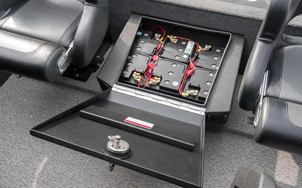 - Fach mit einrastendem Kissen zwischen den Sitzen für Antriebsbatterien
